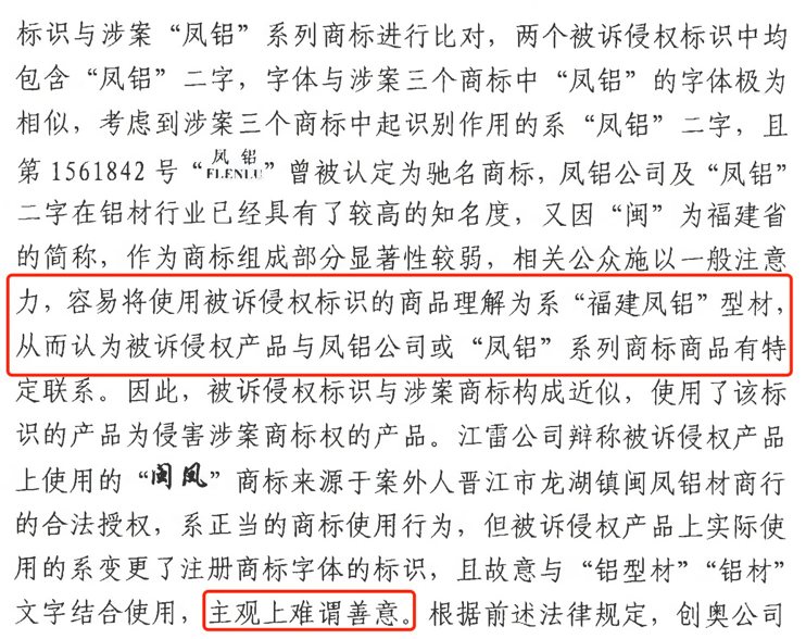 原审法院与再审法院对本案争议焦点的审查思路及认定结果截然不同。再审法院首先审查被诉商标与权利商标的核准使用商品,二者核定使用于相同商品品类;其次,被诉侵权标识“闽凤铝型材”和“闽凤铝材”标识,用于产品包装膜上,系识别商品来源的商标性使用;再者,被诉“闽凤”商标改变字体且与“铝型材”、“铝材”相同的字体一并使用,属于不规范使用(与原审对不规范使用的审查标准明显不同);值得注意的是本案之所以要认定被诉侵权商标属于不规范使用,是法院管辖的需要,根据法律及相关司法解释规定,规范使用的商标之间的纠纷应当提交商标局裁定,不属于法院的管辖范围(驰名商标除外)。最后,法院根据二者的比对,认为“闽凤”商标的显著部分在于“凤”,该显著识别部分与权利商标“凤铝”的主要认读“凤”相同,因此二者构成商标近似。被诉侵权商标用在铝型材上,容易造成相关公众对该商品的来源产生误解,从而认为该商品源于再审申请人凤铝公司。